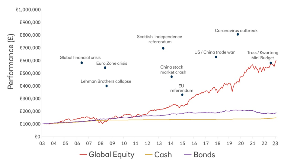 The below graph from NatWest from December 2023 covering the period between 2003 and 2023 highlights this, showing the return on global equities (shares), bonds, and cash at critical points in history. Although cash remains relatively level, the eventual returns from bonds and equities would have been higher.